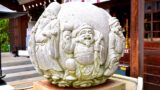 七つの福を身につけながら歩けるという石階段には、七福神の石像がにっこりと。