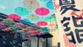 祭りの期間中、アーケードにはたくさんの露店が並び、店主たちの手作りの風情あるはりぼて飾りや吹き流しがアーケードを埋め尽くします。